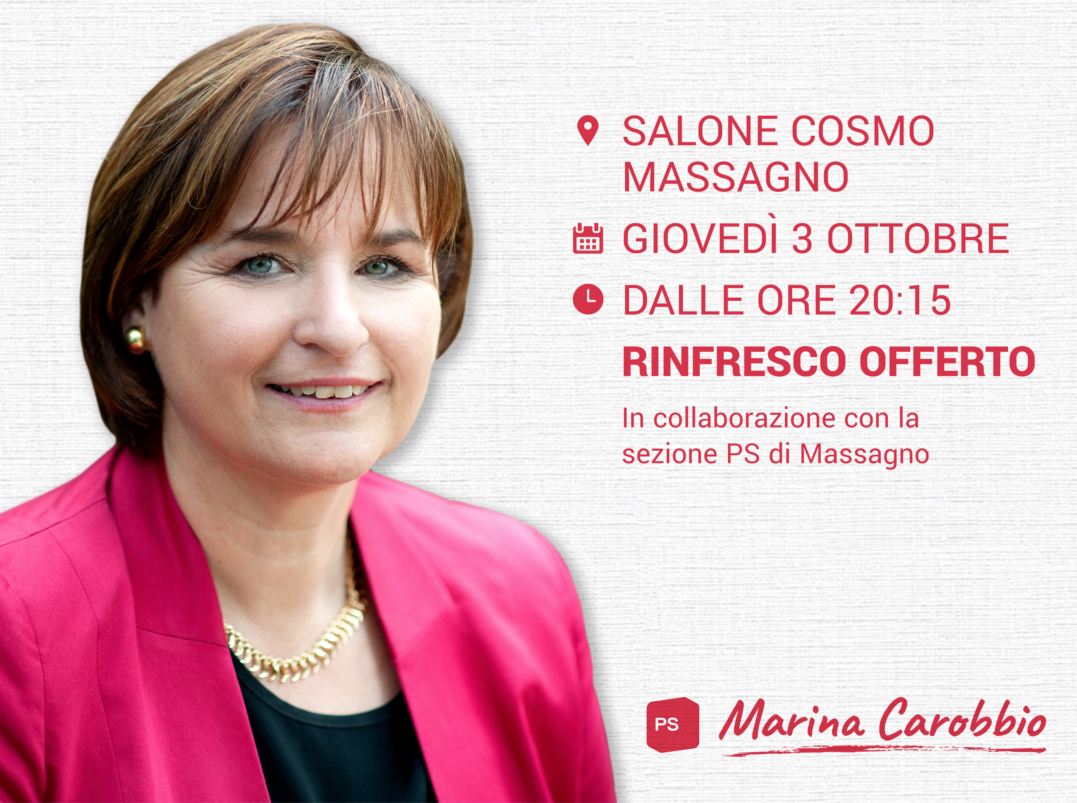 Dialogando con Marina Carobbio Un dialogo interessante tra Marina Carobbio, sensibile e competente per professione e per lunga esperienza parlamentare, con il pubblico il 3 ottobre 2019 a Massagno. Nessuno di noi immaginava a quella data il formidabile successo della sua candidatura al primo turno a Massagno e al secondo in tutto il Ticino.
