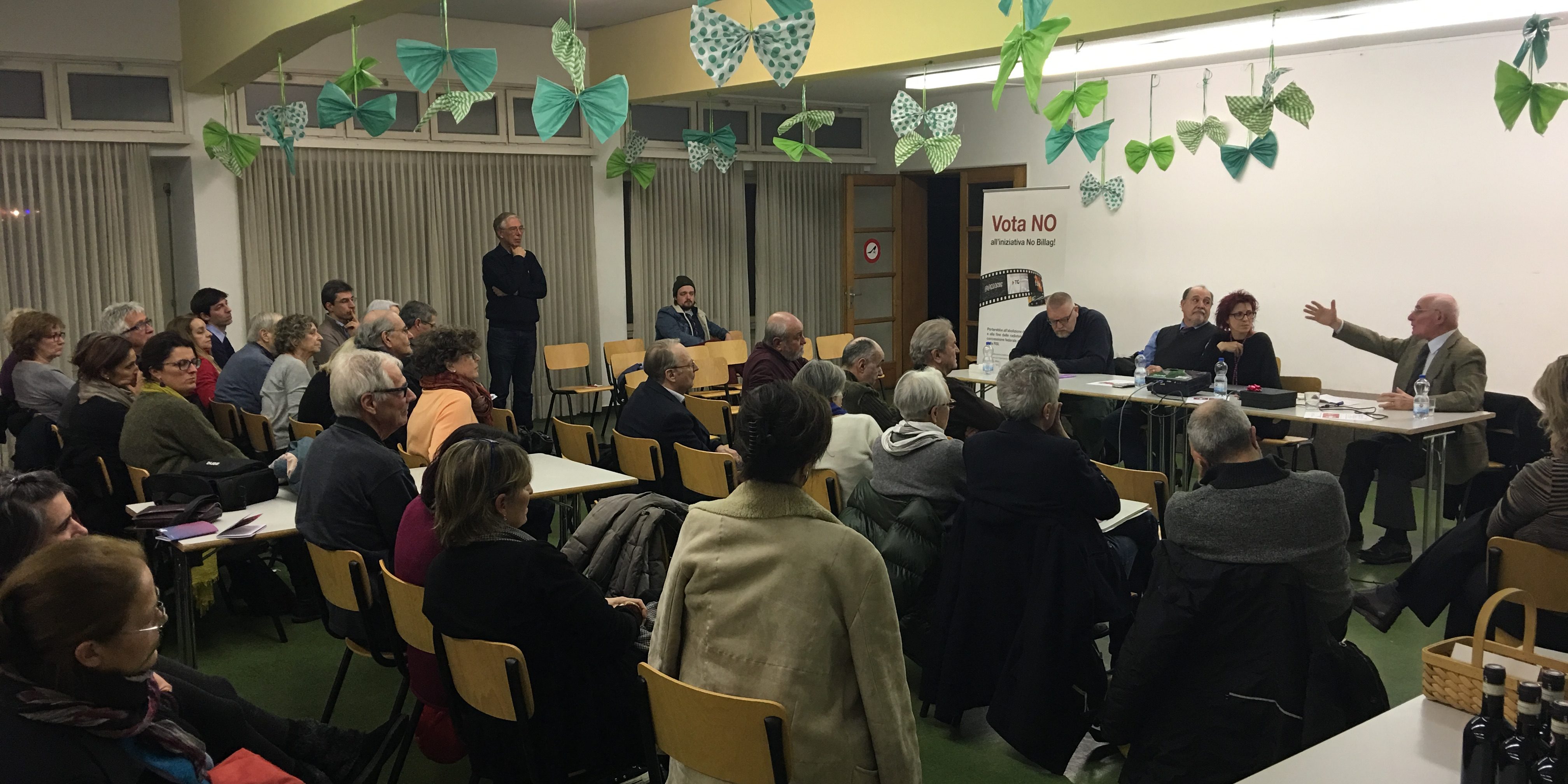 In alto il numeroso pubblico e i relatori (da destra a sinistra): il giornalista e saggista Enrico Morresi, Amalia Miranda docente presso facoltà di economia USI, il professore emerito Mauro Baranzini presso facoltà di economia USI, Paolo Riva giornalista RSI rete tre.